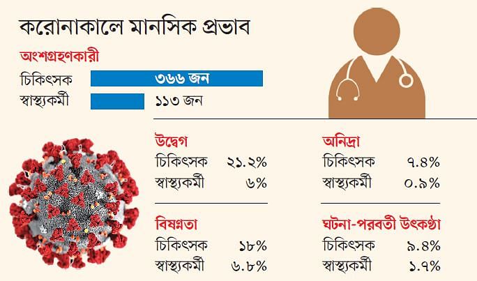 জরিপে উঠে এসেছে, প্রায় ২১ শতাংশ চিকিৎসক এবং ৬ শতাংশ সহযোগী স্বাস্থ্যকর্মী উদ্বেগে ভুগেছেন। এ ছাড়া ১৮ শতাংশ চিকিৎসক এবং প্রায় ৭ শতাংশ সহযোগী স্বাস্থ্যকর্মী বিষণ্নতায় ভুগেছেন।