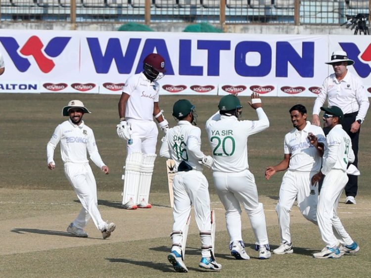 দুই উইকেটে ৭৫ রান নিয়ে তৃতীয় দিন শুরু করা উইন্ডিজের ওপর দিনের প্রথম বলেই আঘাত হানেন তাইজুল ইসলাম। বাঁহাতি এই স্পিনারের বলে স্লিপে থাকা নাজমুল হোসেন শান্তর হাতে ক্যাচ তুলে দিয়ে ফেরেন ঙ্ক্রুমাহ বোনার (১৭)।