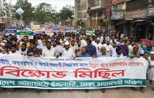 বাংলাদেশ জামায়াতে ইসলামী ঢাকা মহানগরী দক্ষিণের উদ্যোগে সরকারের সীমাহীন দুর্নীতি, অব্যবস্থাপনা ও অপরিণামদর্শী সিদ্ধান্তের ফলে বিদ্যুৎ সেক্টরে মহাবিপর্যয়ের প্রতিবাদে আজ বৃহস্পতিবার রাজধানীতে বিক্ষোভ মিছিল ও সমাবেশ অনুষ্ঠিত হয়।
