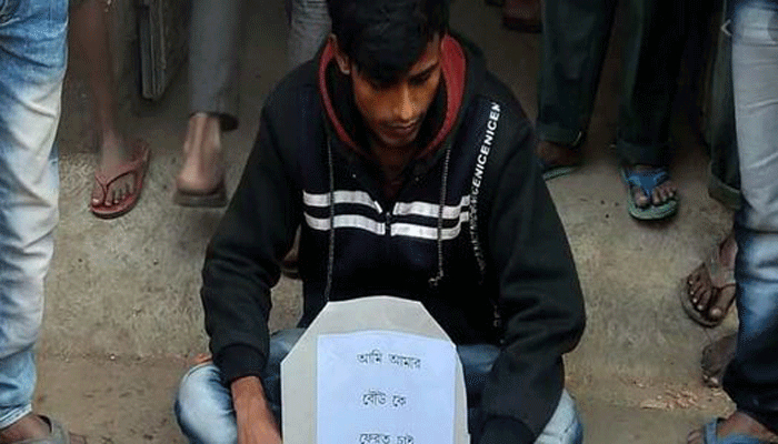 বউ ফেরত চেয়ে পোস্টার হাতে শ্বশুরবাড়ির সামনে যুবক